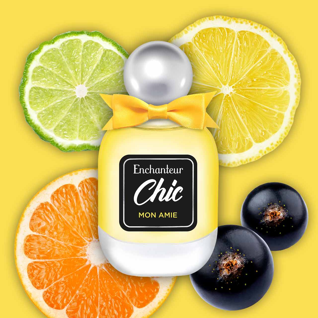 Enchanteur Chic Mon Amie Eau de Toilette is a vibrant uplifting fragrance with a zesty mix of lemon, orange and bergamot combining with red apple, enhanced with a bouquet of pink peonies and roses enveloped in warm amber.
